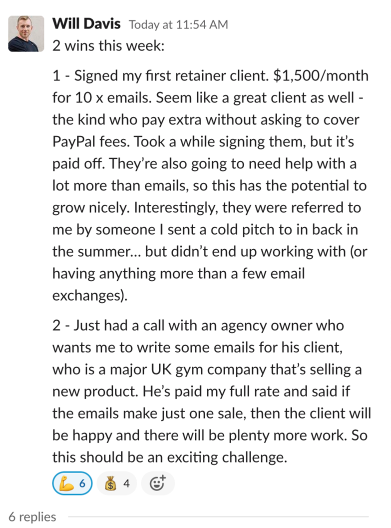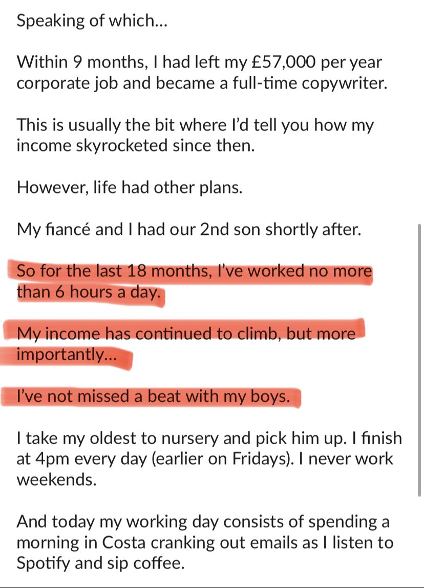 Some people just want to replace their corporate salary with income from copywriting, while ditching their daily commute, and cutting 2-3 hours from their working day.